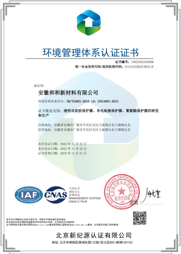 - Environmental Management System Certification (GB/T24001 – 2016 idt ISO14001:2015):